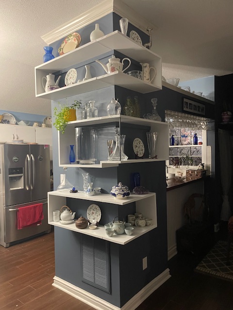 Custom floating shelves built with items organized and put in place